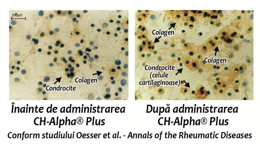 CH Alpha Plus Colagen lichid are eficacitate dovedita stiintific in regenerarea cartilajelor deteriorate si a tesuturilor conjunctive la nivelul intregului organism, stimuland in mod real refacerea condrocitelor (celule cartilaginoase).